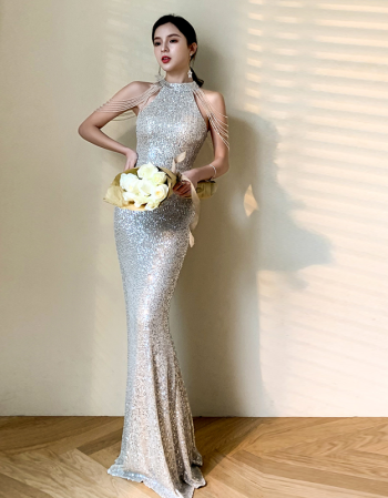 商品名称 雪宝莲2020新款修身鱼尾挂脖性感肩流苏晚礼服女气场鱼尾重工生日派对连衣裙长款品质感宴会年会主持人 银色 M