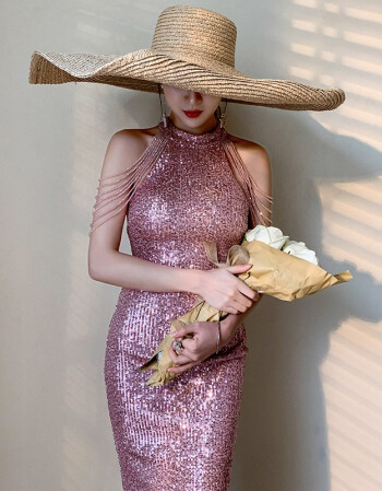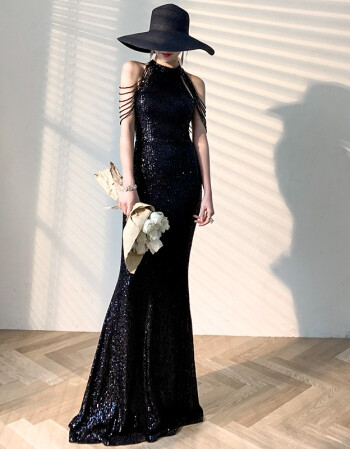 • 雪宝莲2020新款修身鱼尾挂脖性感肩流苏晚礼服